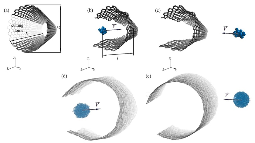 Кроме того, чтобы исследовать механизмы синтеза композитных частиц разной морфологии в плазменной струе, ученые провели моделирование методом молекулярной динамики. Авторы задавали в модели разное направление и скорость движения наночастиц меди (от 0,5 до 9 километров в секунду). Ученые установили, что при относительно низких скоростях движения наночастиц (менее 1 километра в секунду) медь, сталкиваясь с графеновой чешуйкой, прикрепляется к ней; при средних скоростях (от 1 до 5 километров в секунду) — «заворачивается» в графен, точно в фантик; а при высоких скоростях (более 7 километров в секунду) — разрывает графеновый лист, пролетая сквозь него. Таким образом, понимание того, как в ходе эксперимента были получены медь-графеновые наночастицы, позволяет добиться более совершенной морфологии композита при его синтезе в плазменной струе. Хотя это — далеко не простая задача на будущее.