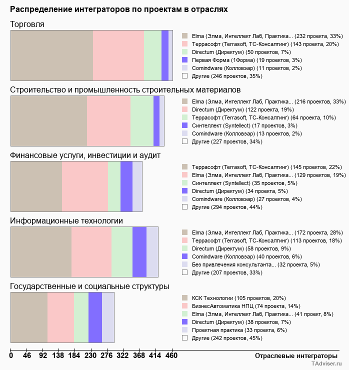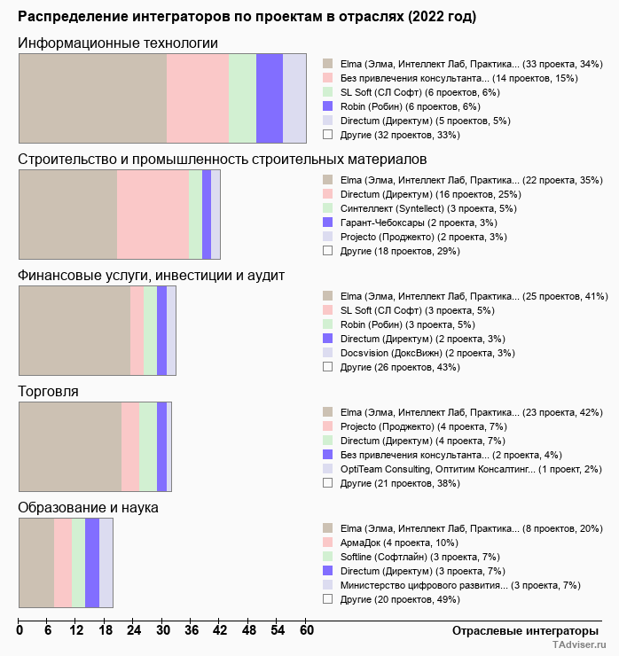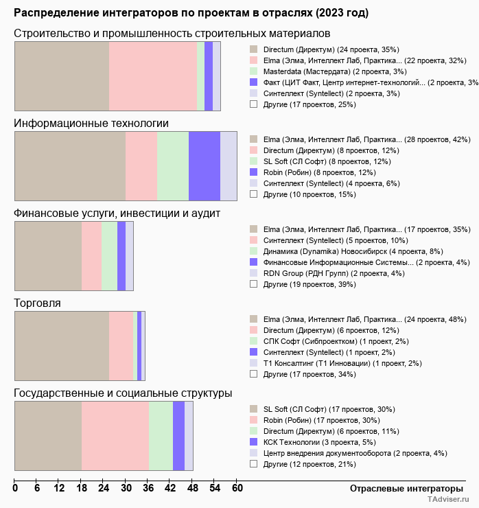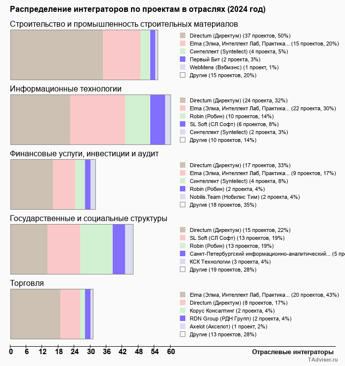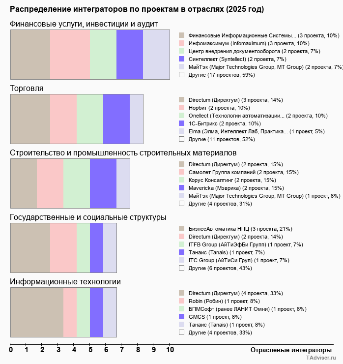 Согласно информации о проектах, содержащейся в базе TAdviser, за последние 4 года BPM-системы чаще всего внедрялись в четырех отраслях - в строительстве, в сфере информационных технологий, а также в финансовых компаниях и ритейлерах. На их долю приходится 36,6% от всех реализованных проектов, известных TAdviser.