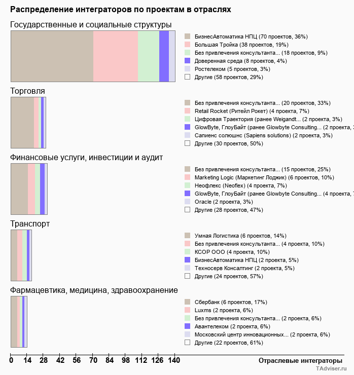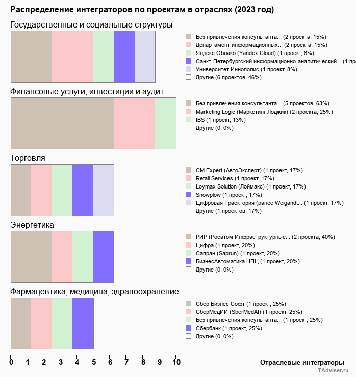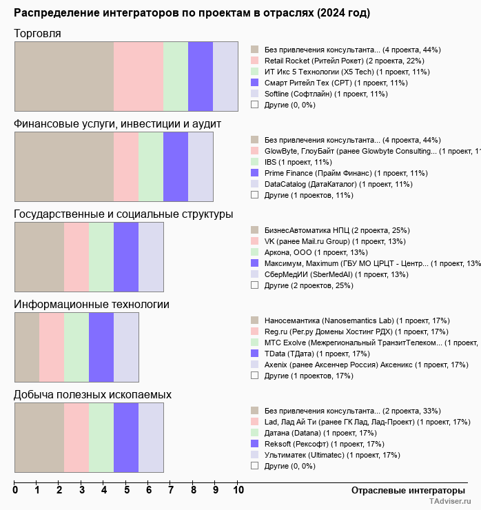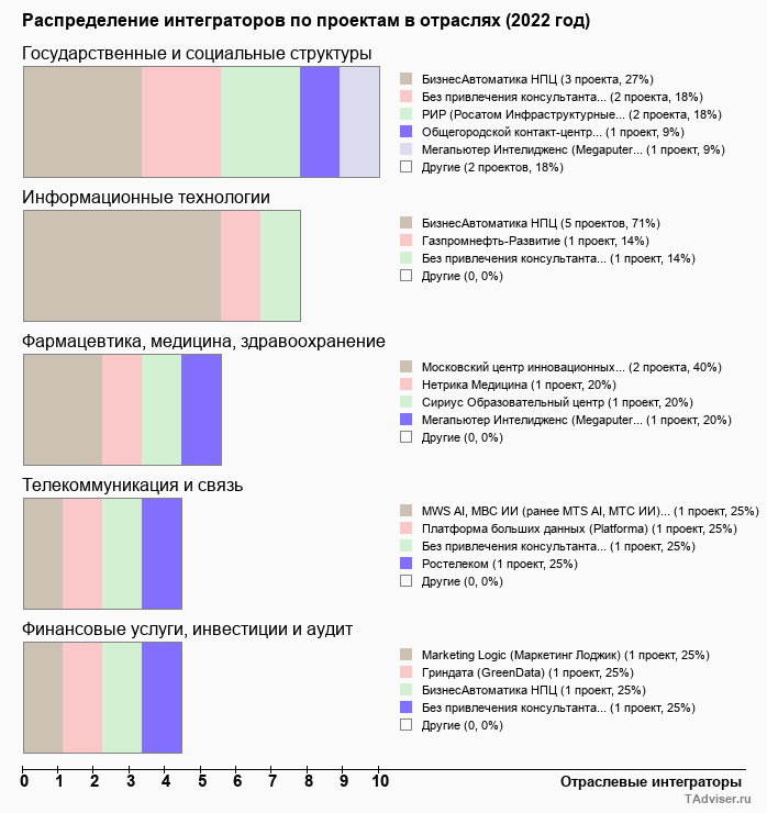 Отраслевое распределение по количеству проектов внедрений
