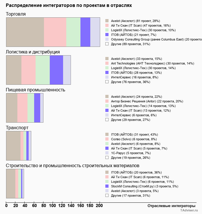 Отраслевое распределение по количеству проектов внедрений