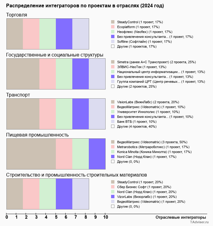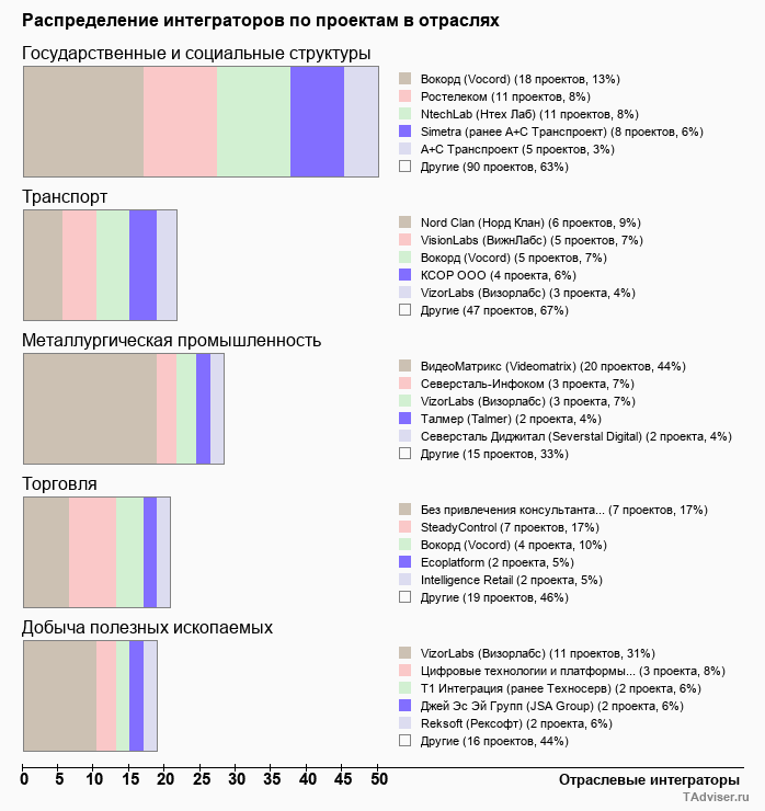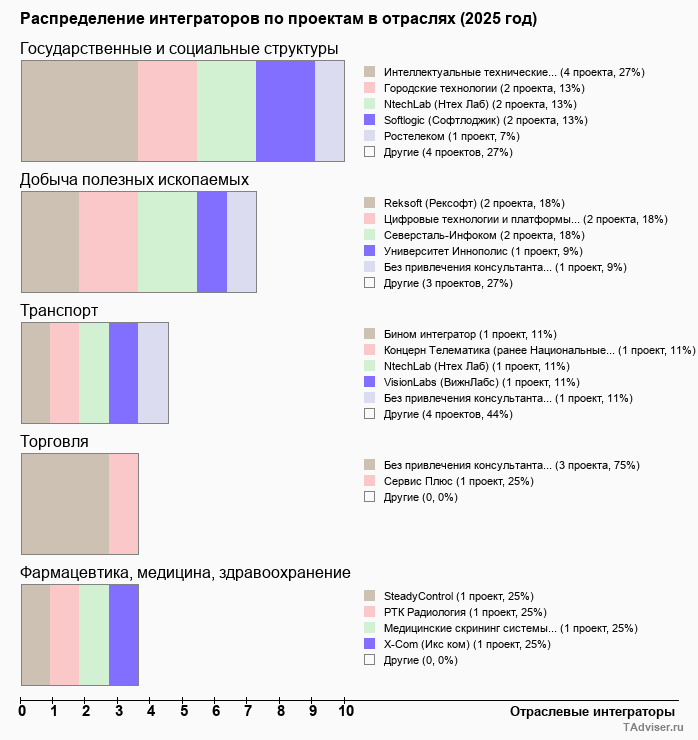 Отраслевое распределение по количеству проектов внедрений